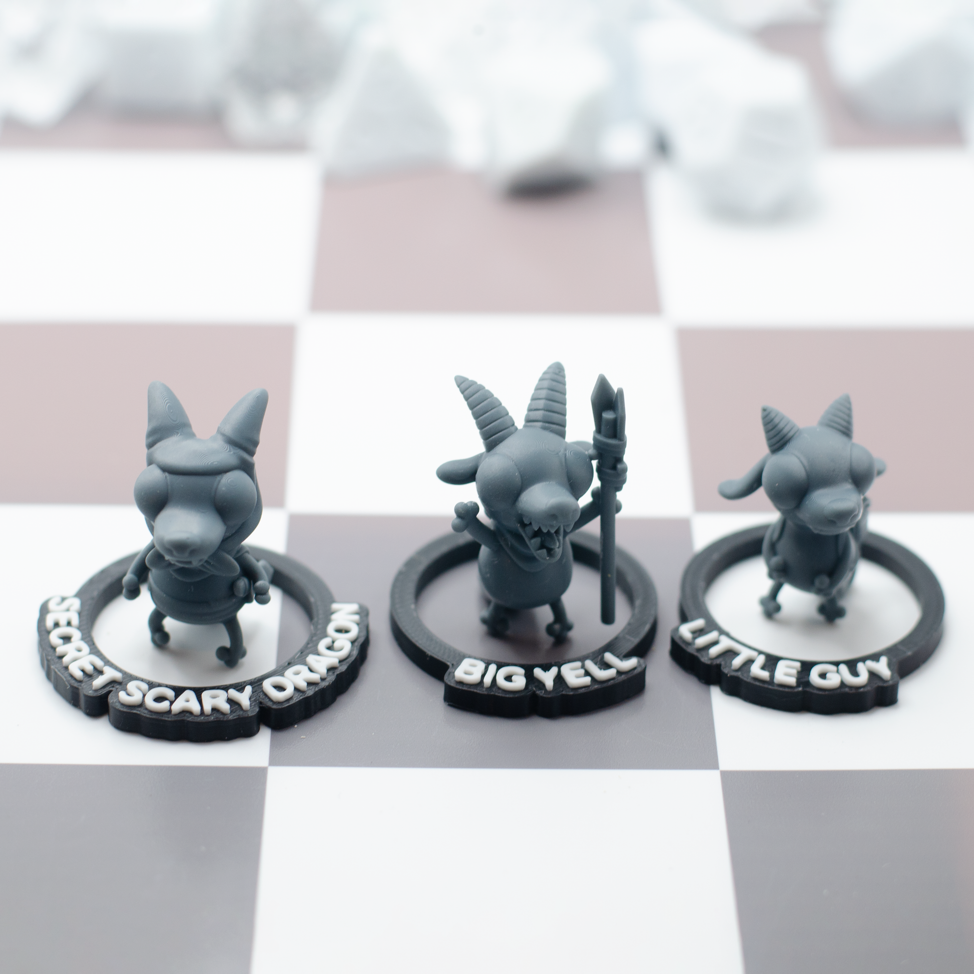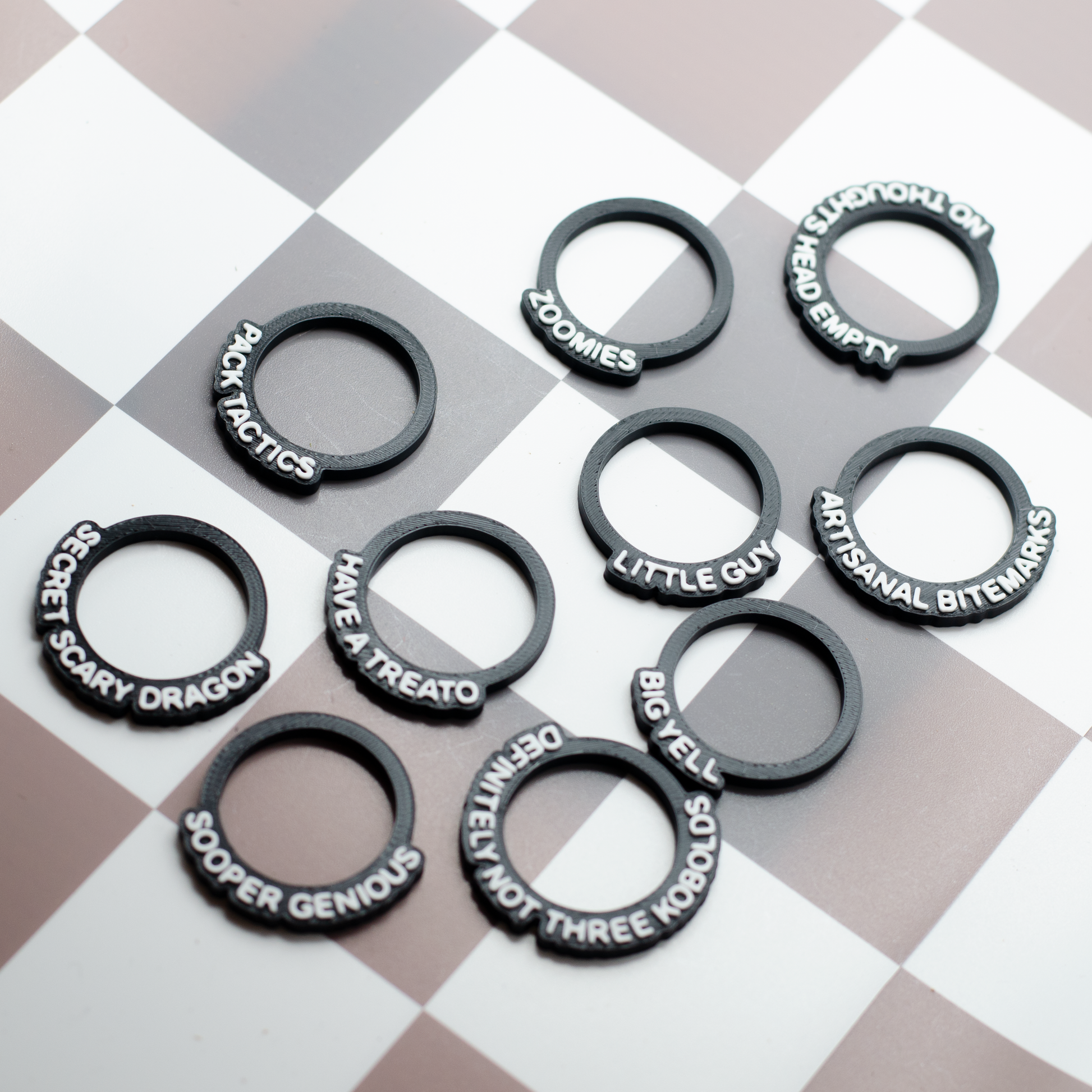 Need to mark your miniatures with status effects, but want something a little bit sillier? These rings feature the following phrases, which are either associated with FFAcrafts kobolds or fantasy kobold tropes (and a couple of instant classics from Popper the kobold, of Baldur's Gate 3).